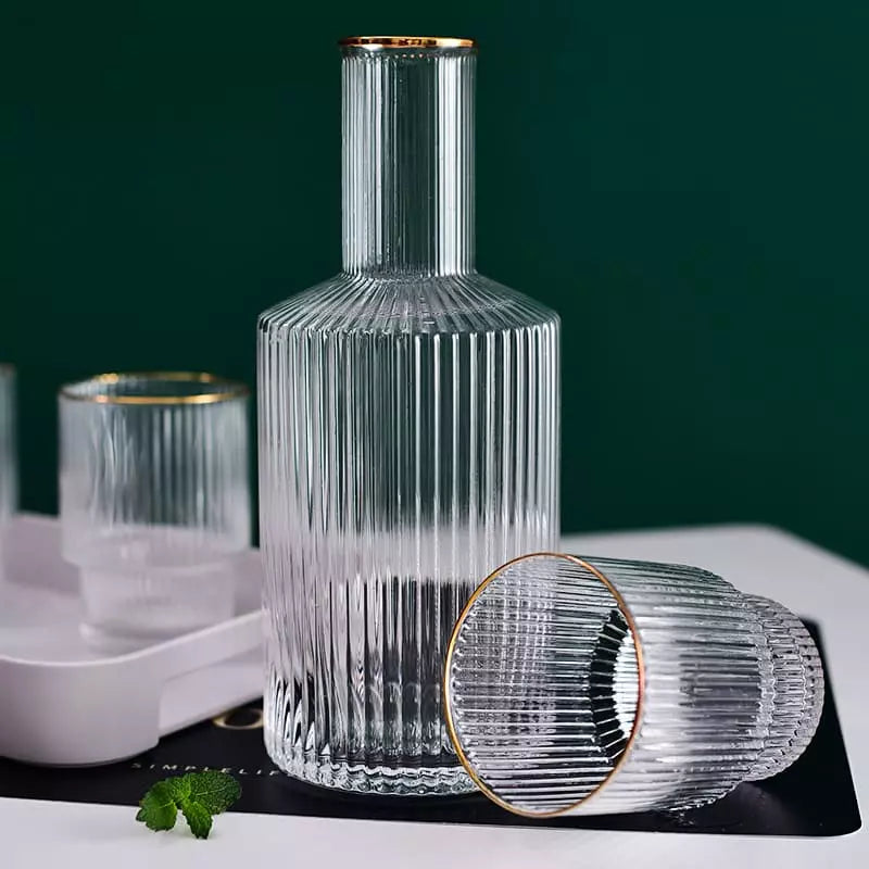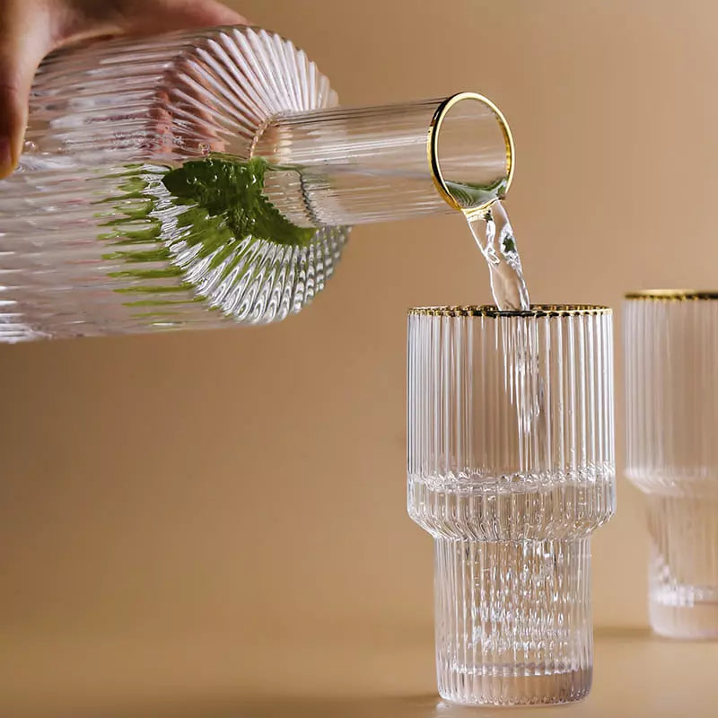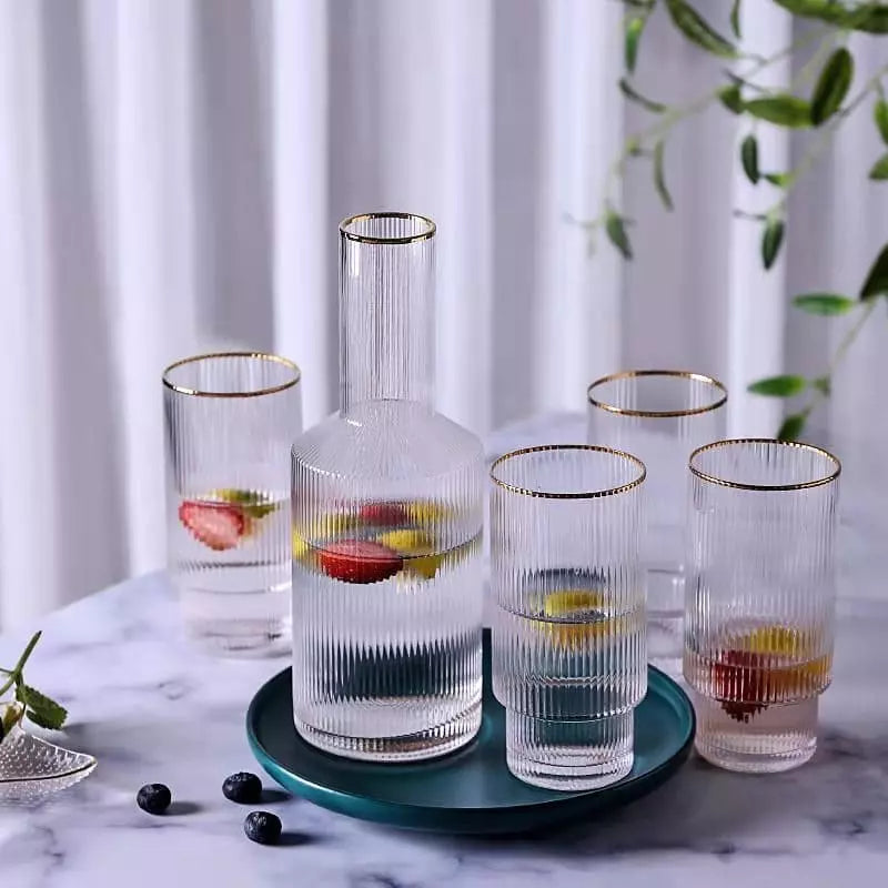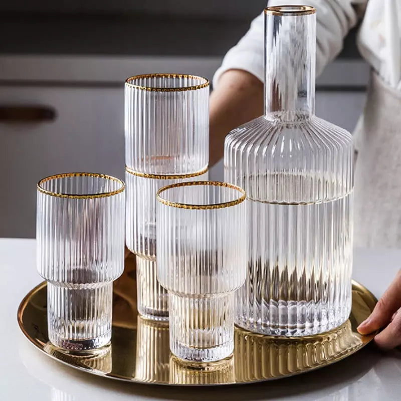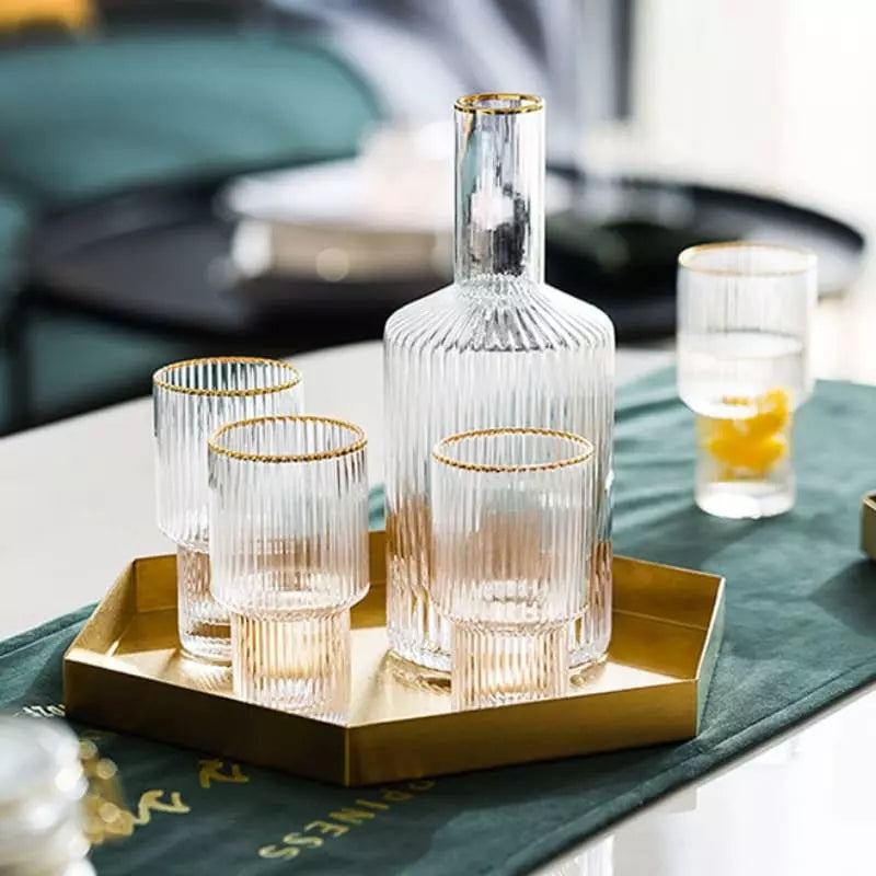 A Jarra de Vidro Borossilicato com Copos Jarra de Suco é perfeita para todos os momentos. Feito de vidro borossilicato extremamente resistente esse belo conjunto suporta temperaturas quentes e frias para servir tudo o que quiser. Conta com lindo design em listras, acabamento em dourado e 4 copos para servir.
