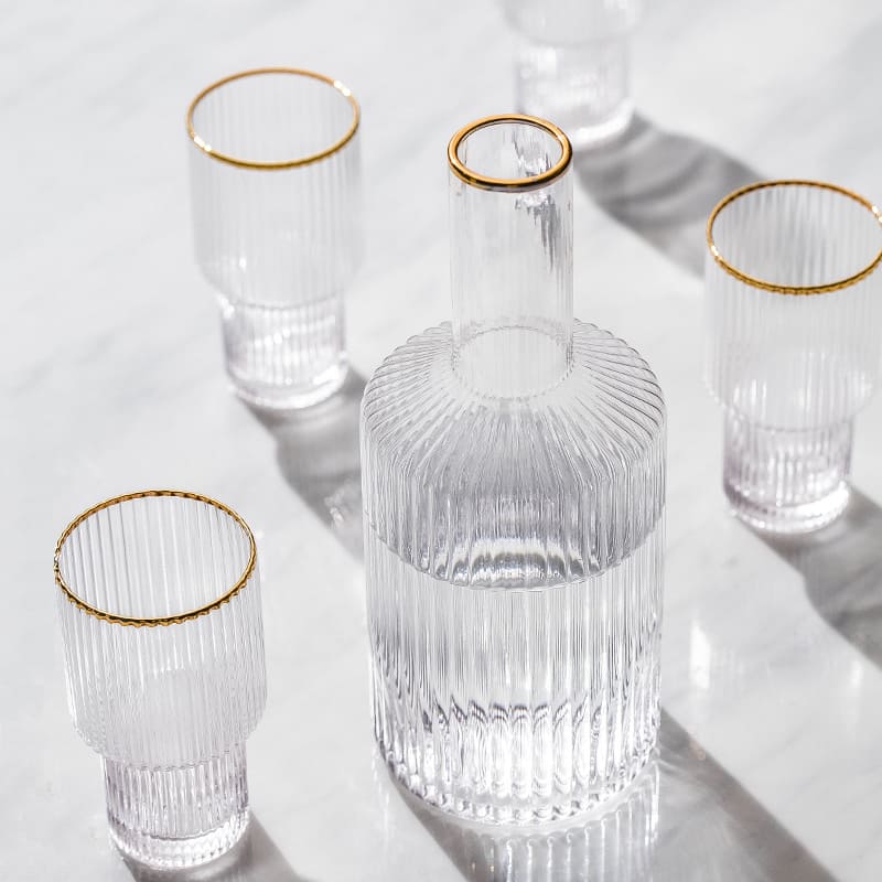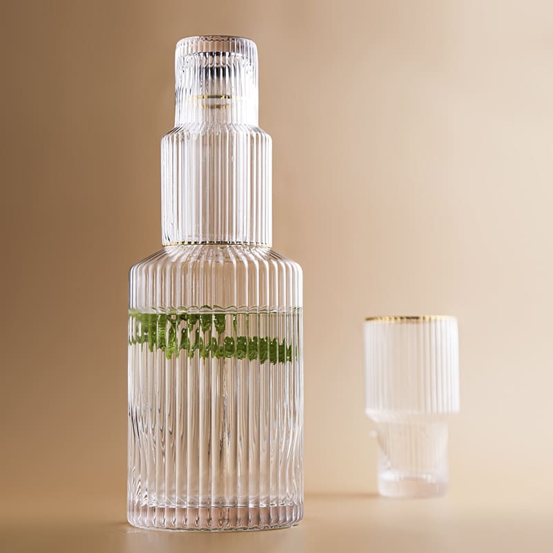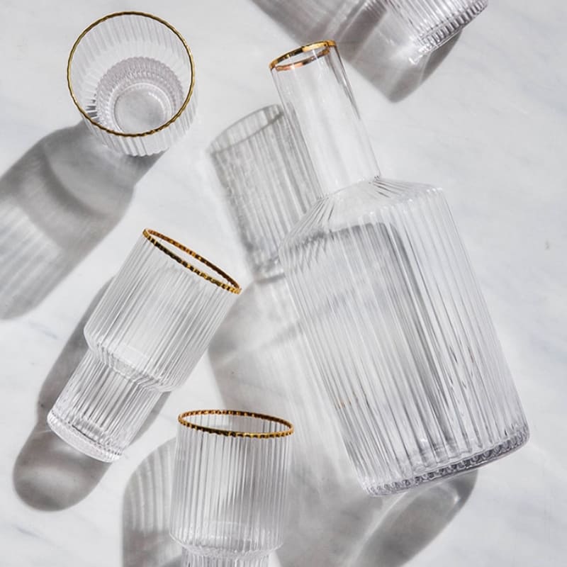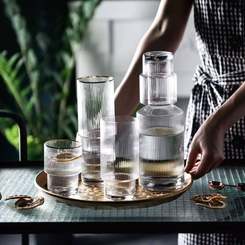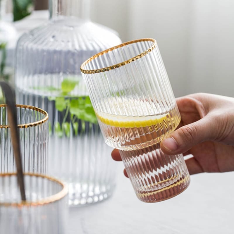 A Jarra de Vidro Borossilicato com Copos Jarra de Suco é perfeita para todos os momentos. Feito de vidro borossilicato extremamente resistente esse belo conjunto suporta temperaturas quentes e frias para servir tudo o que quiser. Conta com lindo design em listras, acabamento em dourado e 4 copos para servir.