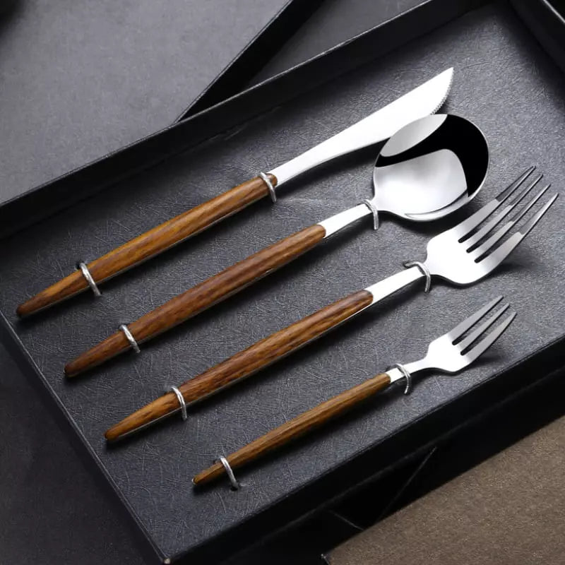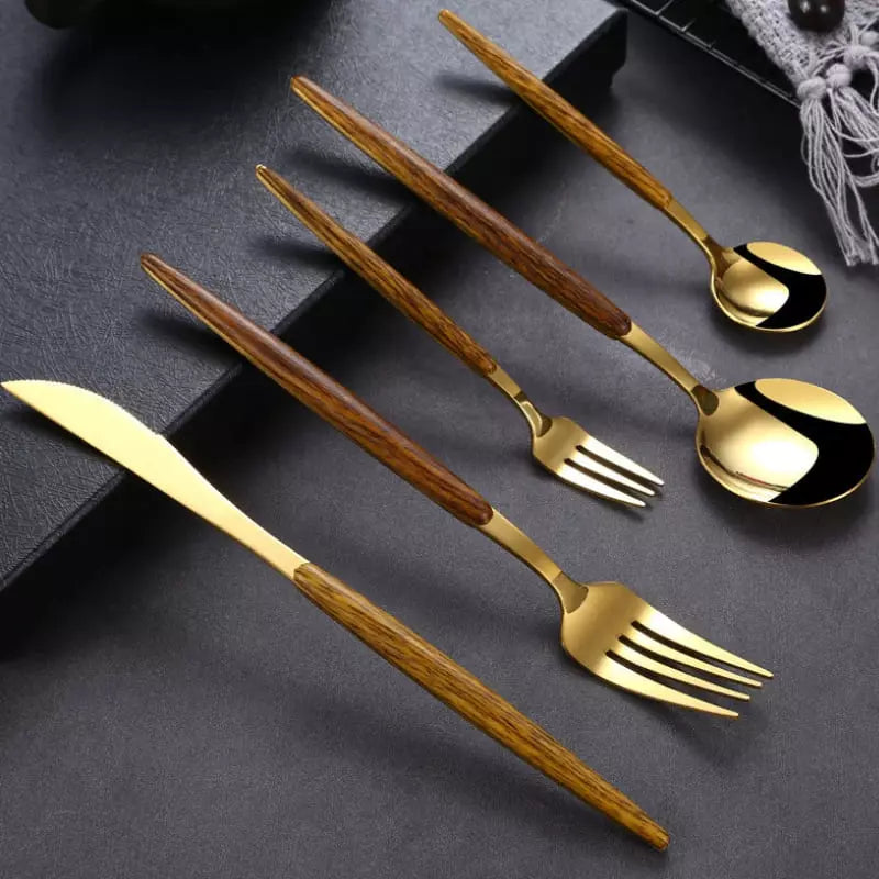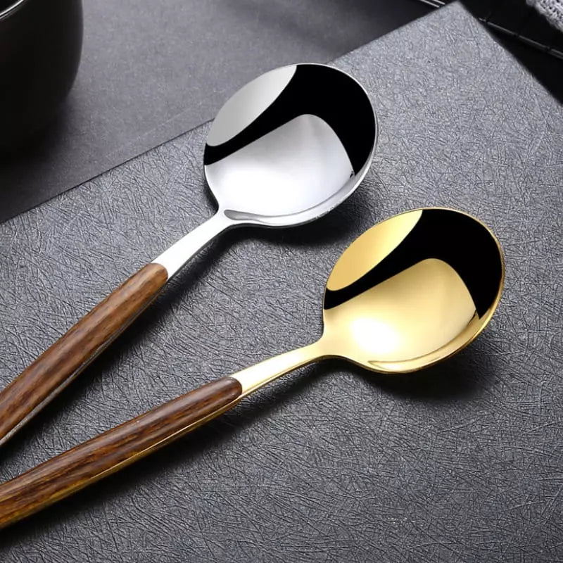O jogo de Talheres Inox 30 Peças com Cabo de Madeira é um ótimo kit de decoração para sua mesa. Para dar um toque mais pessoal, escolha entre Dourado e o Prata para uso próprio ou para presentear alguém especial. Feito de inox 430 durável e à prova de corrosão. O que há de melhor e mais bonito na sua casa.