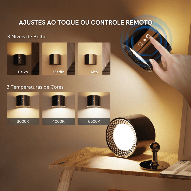 A Arandela de Parede Interna LED Bifocal Sem Fio é perfeita para quem busca praticidade e sofisticação. Recarregável e com controle remoto, oferece 3 níveis de brilho e 3 temperaturas de cor. Fácil de instalar e ideal para qualquer ambiente, sem a necessidade de eletricistas ou instalações complicadas.