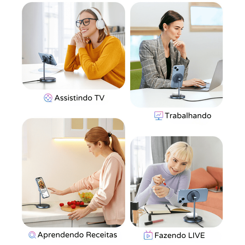 O Carregador Por Indução Iphone Airpods Base Magnética da Polihousi é um suporte duplo de carregamento ultra rápido eficiente e estável. Carregue seu iphone e seus airpods simultaneamente com uma base magnética que permite carga imediata ao toque e com ângulo ajustável, sinta-se livre para ajustar com a visão desejada.