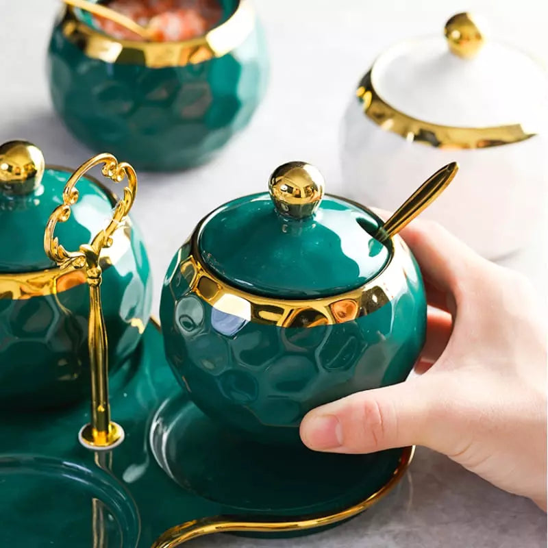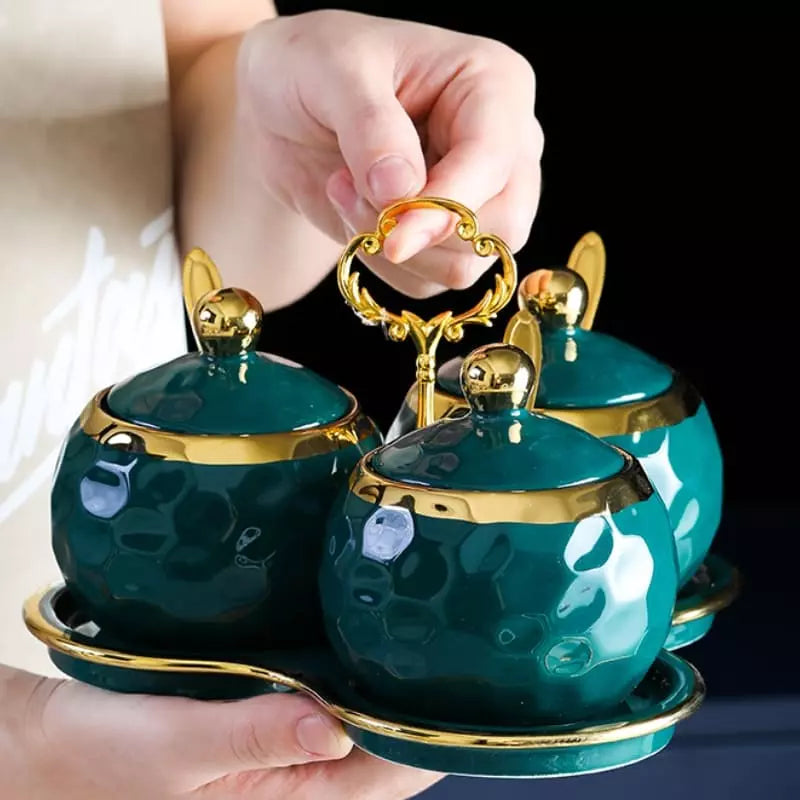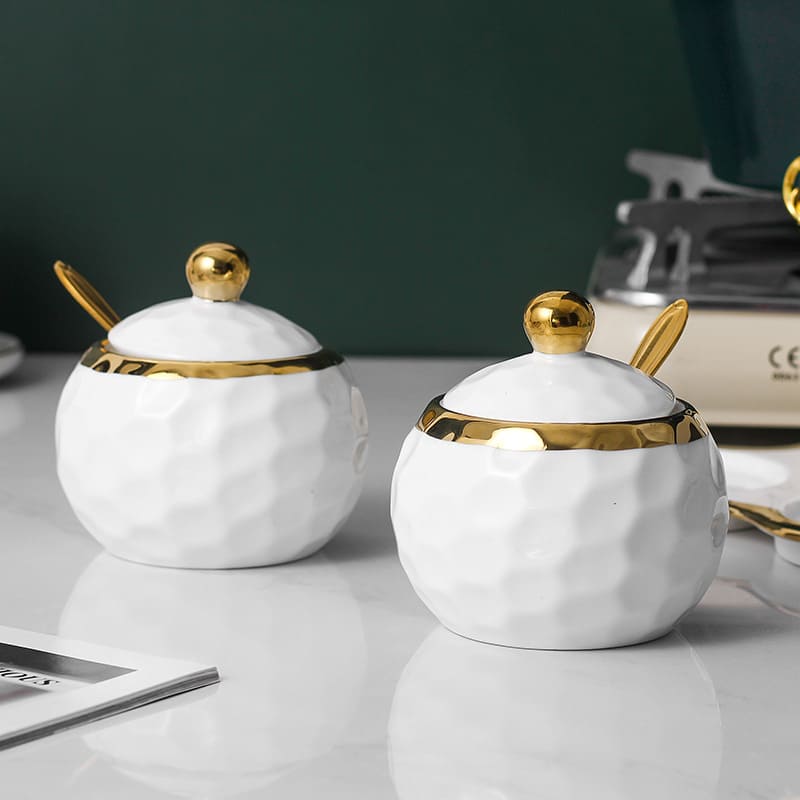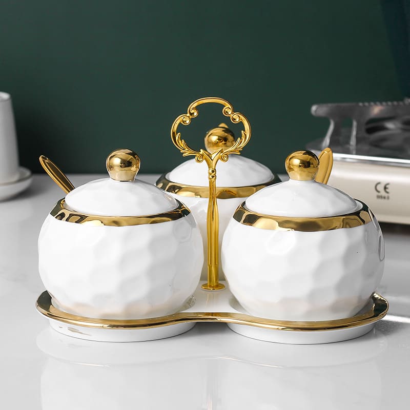 O Conjunto de Potes Cerâmica Kit Açucareiro/Saleiro é um belo armazenador para decorar a sua casa. Conta com 3 potes de cerâmica com tampa e colher que você pode utilizar para grãos, temperos, açúcar e outras especiarias. Decore suas refeições com esse belíssimo kit de cerâmica branco e dourado.